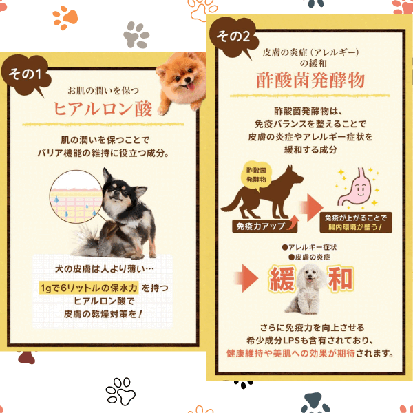 お勧めすることができるポイントの1つとして、皮膚に有効な成分がバランスよく、かつ豊富に含まれていることを挙げることができます。これらの有効成分は愛犬の免疫力を高めるとともに、皮膚のバリア機能などを維持するためにとても効果的だと思いますし、私自身が愛犬に使ってみて信頼しています。